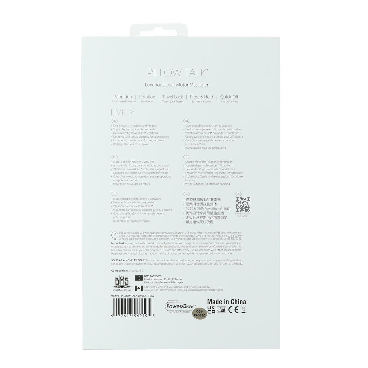Pillow Talk® is a collection that expresses beauty, fun and power. Lively is a luxurious dual-motor vibrator that combines diverse elements of pleasure for your satisfaction. While the curved shaft uniquely rotates for incredible G-spot stimulation, the 3-point attachment vibrates for astonishing clitoral stimulation.